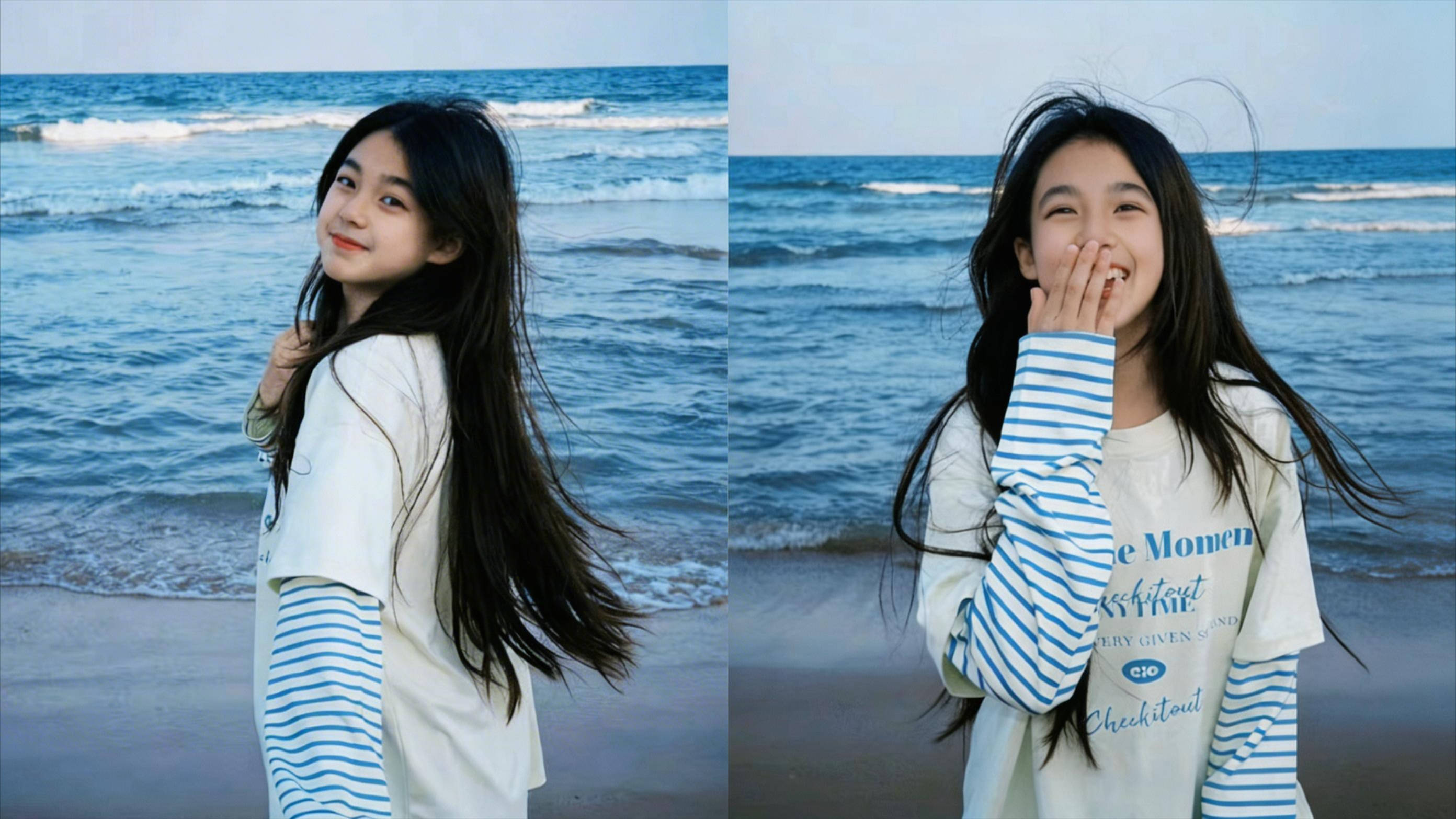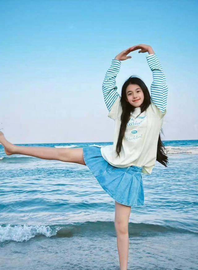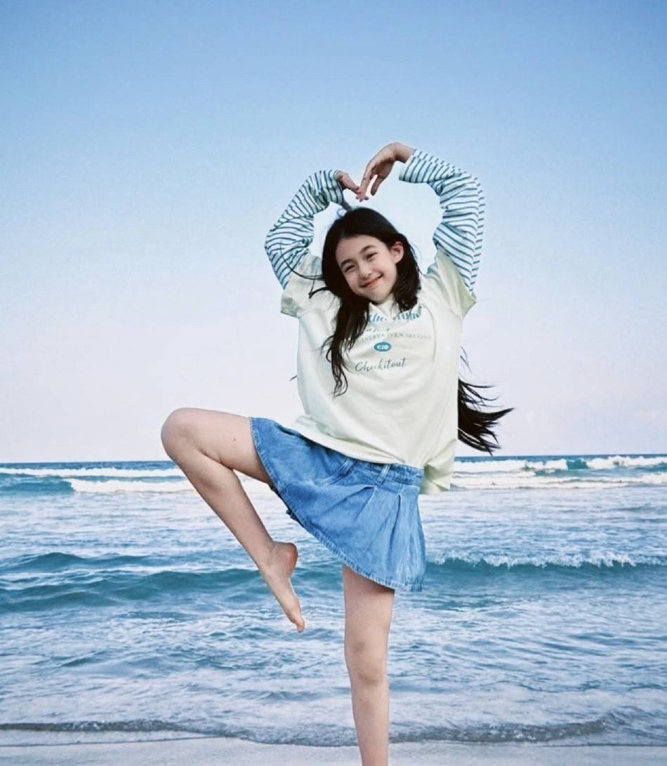 除了运动装的造型,小泡芙在海边玩耍的近照也展现出青春可爱的一面。照片里的她黑发披肩,俏皮比耶,笑容甜美大方,已经显露出少女的窈窕身材。这些照片让网友们感叹,她就像等比例长大一样,颜值依然惊艳。